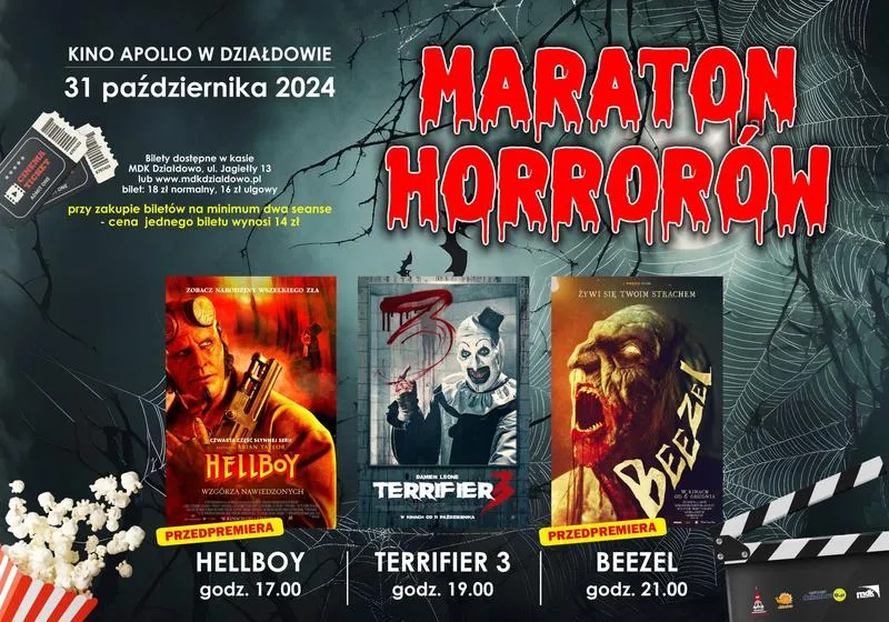 - Maraton horrorów trwa około 479 minut, co oznacza spędzenie całej nocy w kinie.